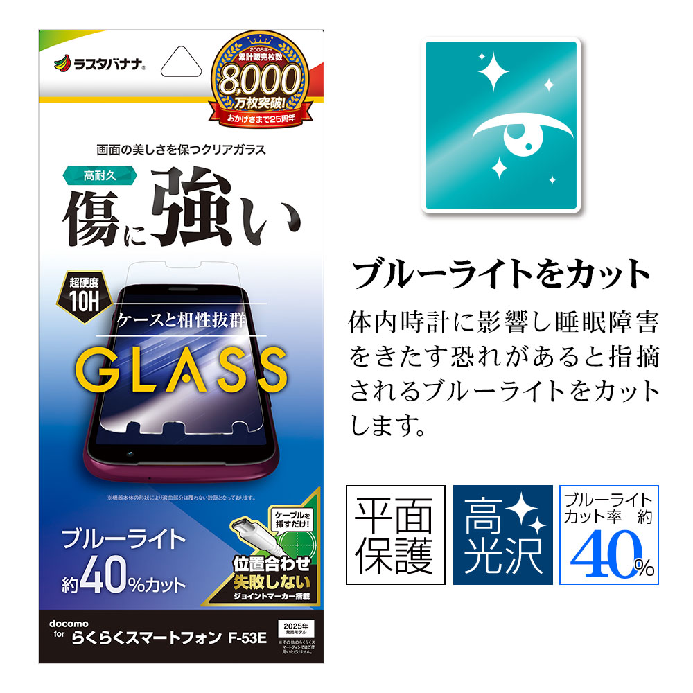 らくらくスマートフォン F-53E ガラスフィルム 平面保護 ブルーライトカット 高光沢 傷に強い ゴリラガラス採用 0.33mm 硬度10H 簡単貼り付け らくらくホン 保護フィルム GGE4660F53E ラスタバナナ